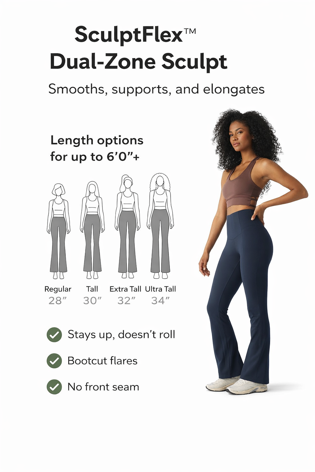 Unlike standard leggings that rely on a single generic fit, SculptFlex™ is available in five thoughtfully engineered length options — Petite, Regular, Tall, Extra Tall, and Ultra Tall — ensuring proportion, balance, and proper drape for every height.
